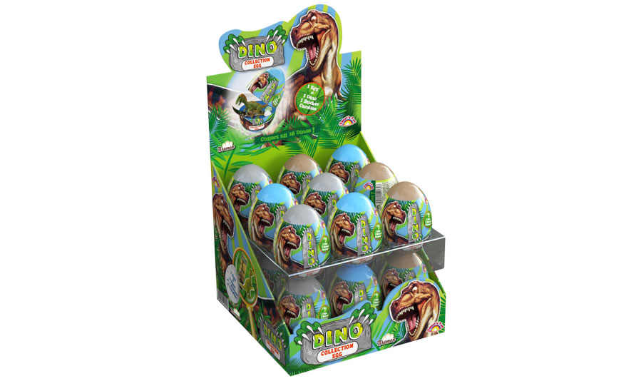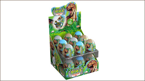 Dino Huevo Sorpresa 5 grs de caramelo sin azúcar - Código de producto: 3310498 - 18 unidades por display - La caja contiene 8 display de 18 unidades cada uno